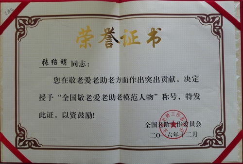 公管处离退休工作科张绍明同志,因在服务老干部工作中勇于创新,用心用情服务老干部,在敬老爱老助老方面做出突出贡献,荣获了“全国敬老爱老助老模范人物”称号。